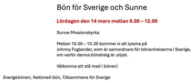 Detta evenemang har redan ägt rum. 14 mar 09:00 - 12:00 Bön för Sverige och Sunne Lägg till i kalender Google Kalender iCalendar Outlook 365 Outlook Live Dela